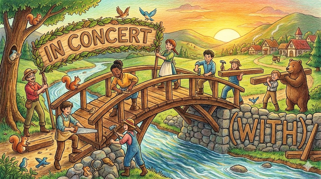- In concert with. (~와 협력하여 / 호응하여. - 오케스트라가 합주하듯, 다른 사람이나 단체와 손발을 맞춰서)