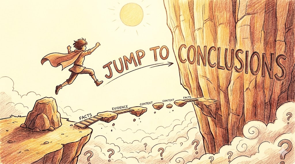- Jump to conclusions. (성급하게 결론 내리다 / 속단하다. - 충분한 증거 없이 서둘러 판단해 버리는 실수)