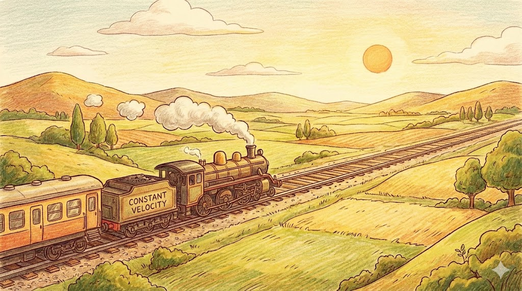 물체의 빠르기(Speed)뿐만 아니라 '방향(Direction)까지 전혀 변하지 않고 일정하게 움직이는 상태' 를 말합니다. 속력이 같아도 방향이 바뀌면(예: 원운동) 등속도가 아닙니다. 알짜 힘이 0일 때 물체는 등속도 운동을 합니다(관성의 법칙).