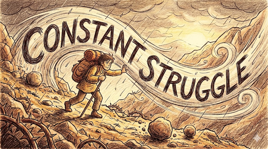 - Constant struggle. (끊임없는 투쟁/노력. - 쉬운 날이 없을 정도로 계속해서 싸우거나 노력하는 상태)