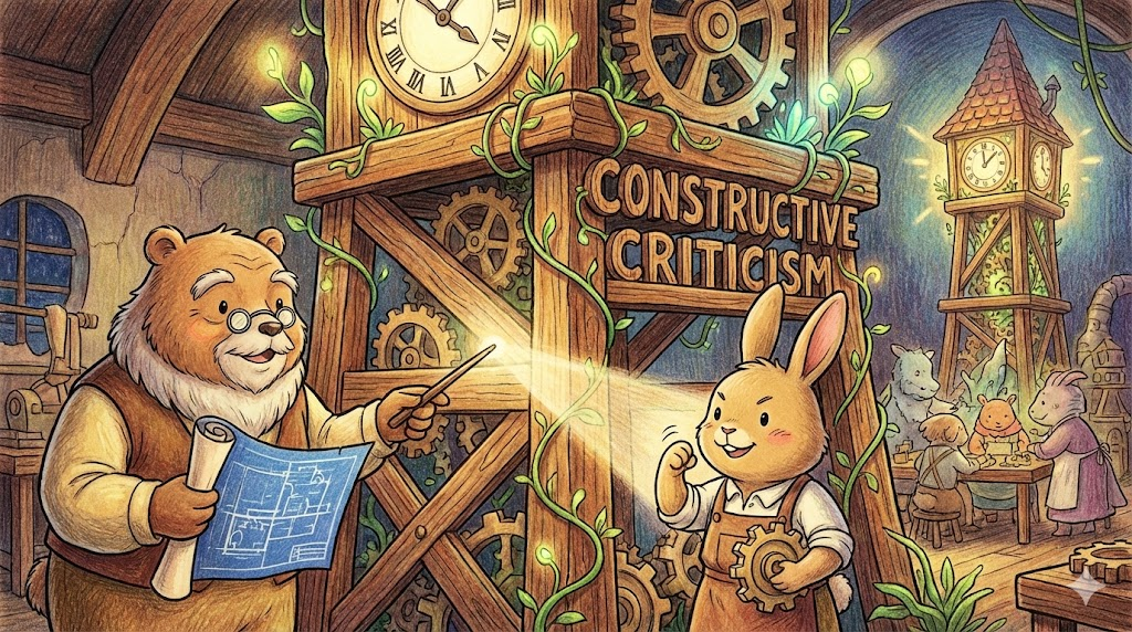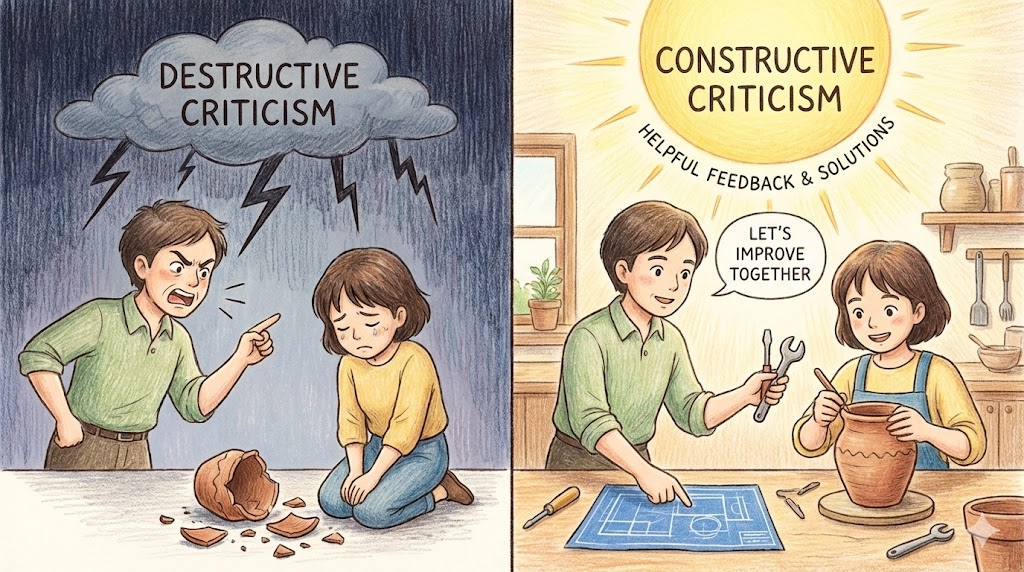단순히 남을 깎아내리거나 기분 나쁘게 하려는 비난(Destructive)이 아닙니다. '상대방이 더 발전하고 개선될 수 있도록 돕기 위해 구체적인 대안이나 해결책을 함께 제시하는 비판' 을 말합니다. 듣는 사람을 무너뜨리는 것이 아니라 '세워주는(Construct)' 것이 목적입니다.