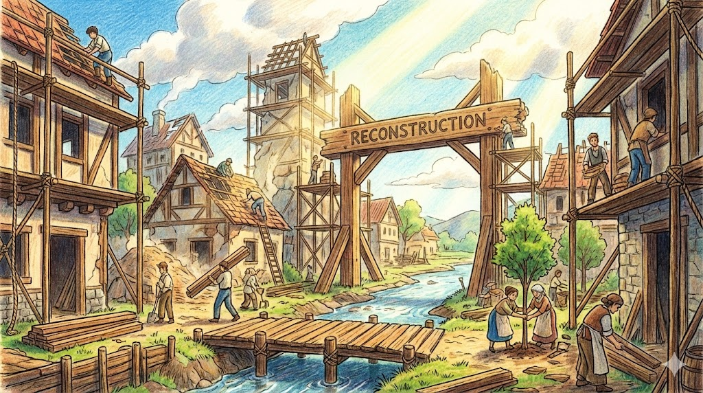 - Reconstruction. (재건 / 복원. - 무너진 것을 다시(Re) 건설하는 것. 미국 역사에서는 남북전쟁 후의 '재건 시대'를 뜻하기도 함)