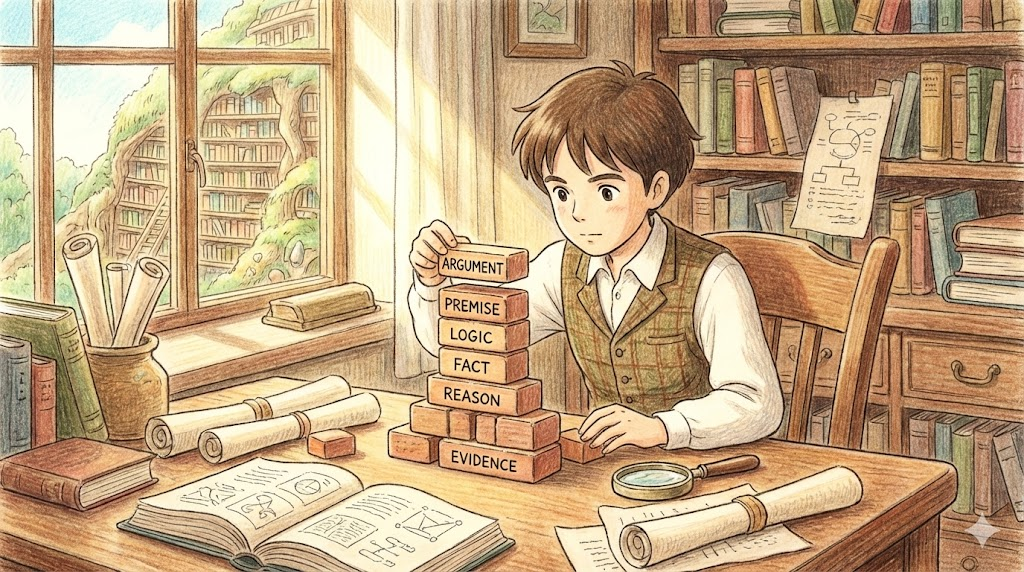 마치 벽돌을 하나하나 쌓아 튼튼한 집을 짓듯이, '논리적인 근거와 증거들을 체계적으로 연결하여 설득력 있는 주장을 만드는 과정' 을 뜻합니다. 단순히 우기는 것이 아니라, 서론부터 결론까지 빈틈없이 논리를 쌓아 올리는 것을 강조하며, 에세이 작성이나 토론, 법정 공방에서 주로 쓰입니다.