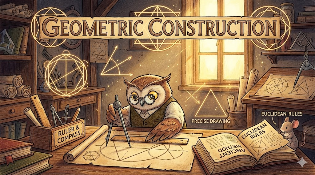 수학 시간에 자(눈금 없는 자)와 컴퍼스만을 사용하여 '도형을 정확하게 그리는 행위' 를 말합니다. 단순히 대충 그리는 스케치(Sketch)와는 다릅니다. 고대 그리스 수학에서 유래한 엄격한 규칙에 따라 정삼각형을 그리거나 각을 이등분하는 등의 과정을 뜻하는 전문 용어입니다.