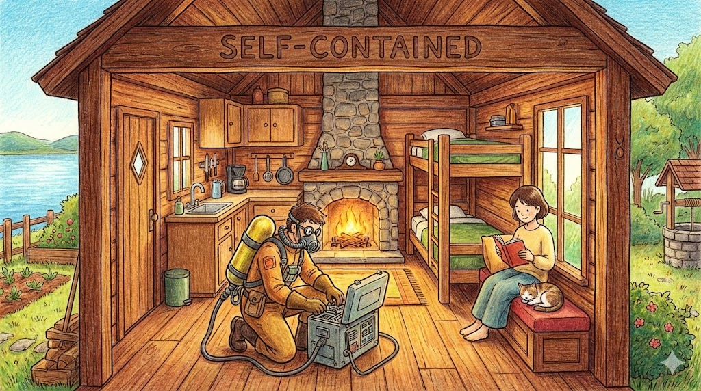 - Self-contained. (자급자족의 / 독립적인. - 남에게 의존하지 않고 필요한 것을 스스로 안에 다 갖추고 있는)