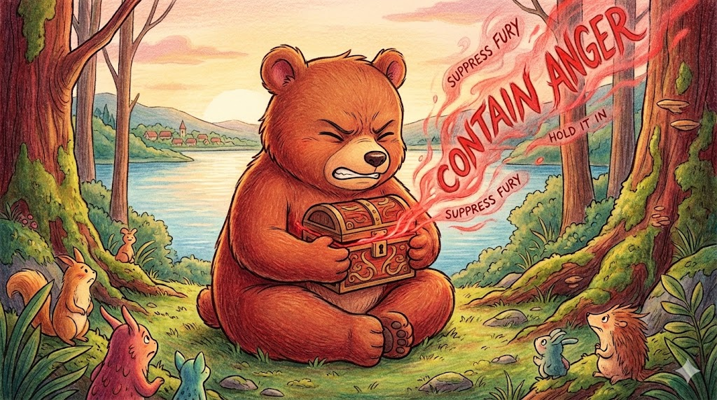 속에서는 불같이 화가 나지만, 겉으로는 평온한 척하거나 소리를 지르지 않으려고 '분노를 마음속 상자에 가두어 두는(Contain) 노력' 을 말합니다. 단순히 화가 풀린 것이 아니라, 터뜨리지 않고 꾹 참고 있는 긴장된 상태를 묘사합니다.