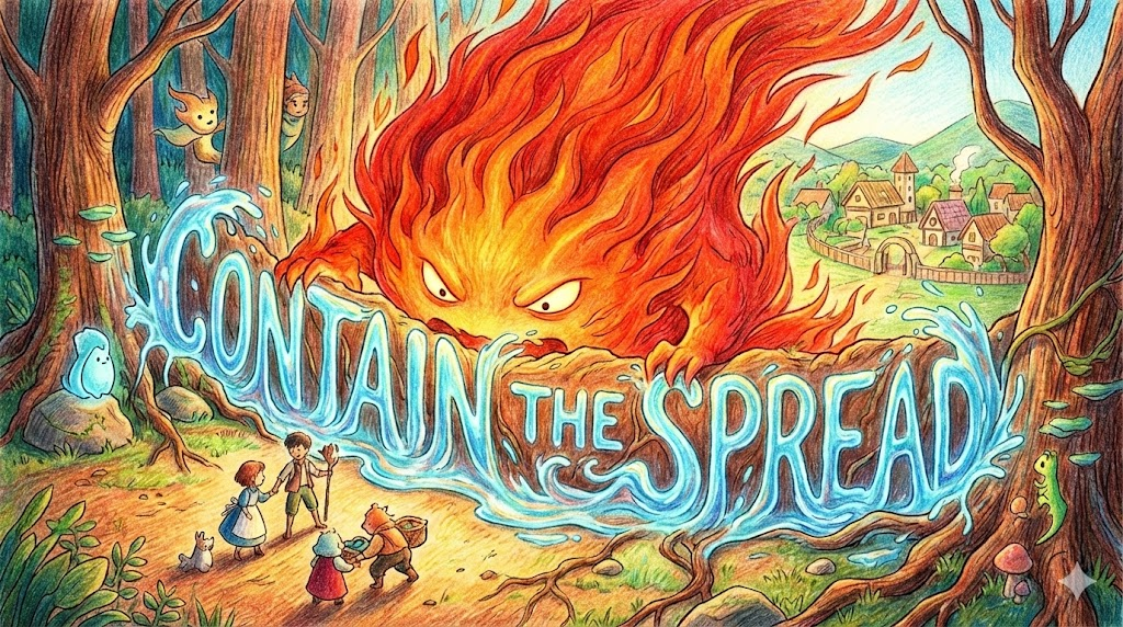 | contain the spread | 확산을 막다 | 동사구, '방어'. | '퍼지는' '것을' '울타리' '안에' '가두다' '(' 'contain' ')'. |