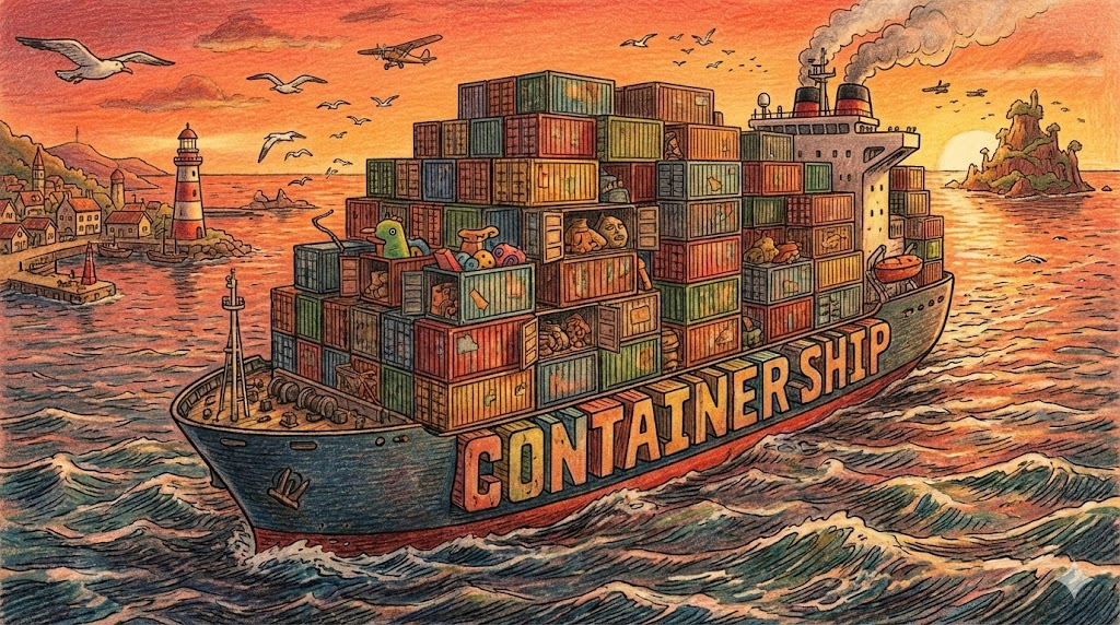 현대 무역의 핵심입니다. 규격화된 금속 상자(컨테이너)를 수천 개씩 층층이 쌓아 나를 수 있도록 특수 설계된 거대한 화물선을 말합니다. 벌크선(석탄, 곡물 등을 그냥 붓는 배)과 달리, '규격화된 물류 시스템' 을 상징하는 단어입니다.