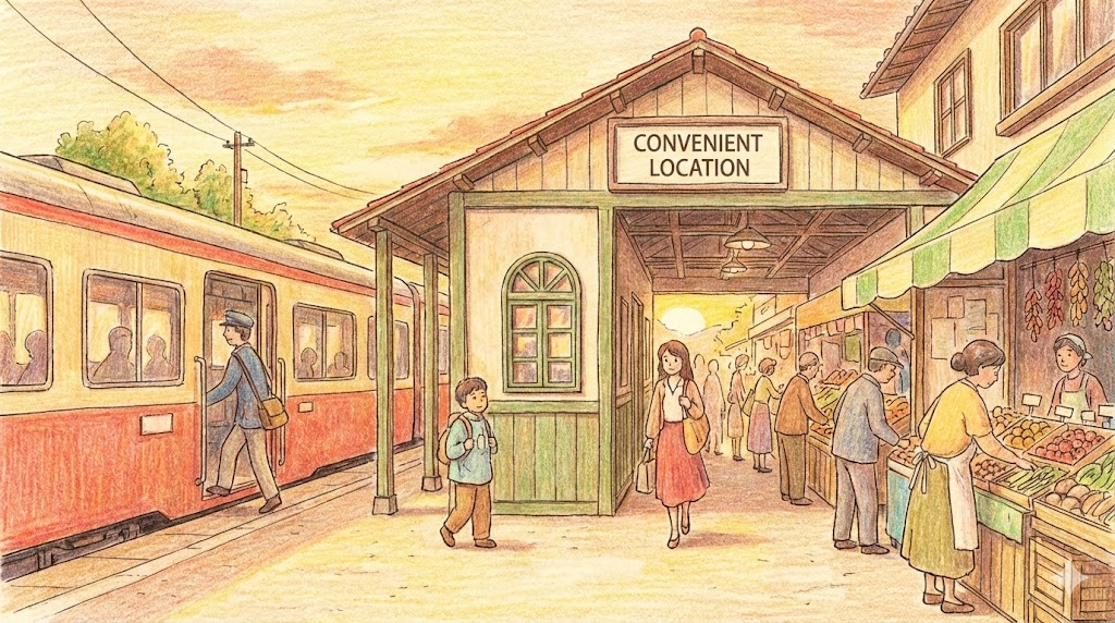 - 해석: (부동산/여행) 역에서 가깝거나 접근성이 좋아서 찾아가기 쉬운 장소를 말합니다.