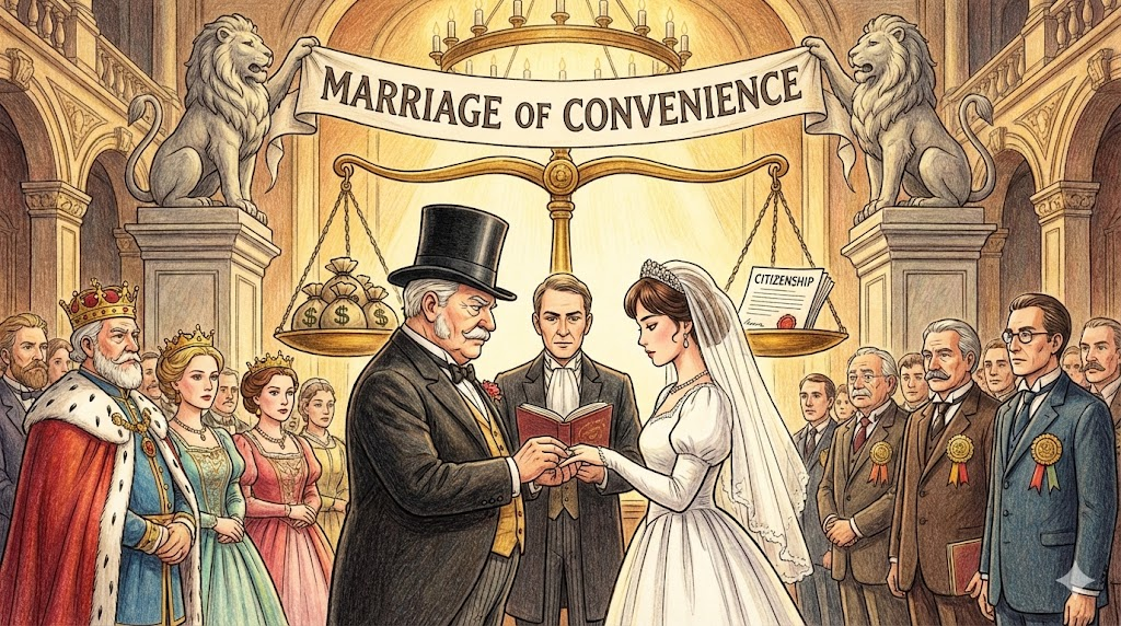 - 해석: (사회/문화) 사랑해서가 아니라, 비자 취득, 재산, 가문 간의 결합 등 실리적인 이득(Convenience)을 목적으로 하는 결혼입니다.
