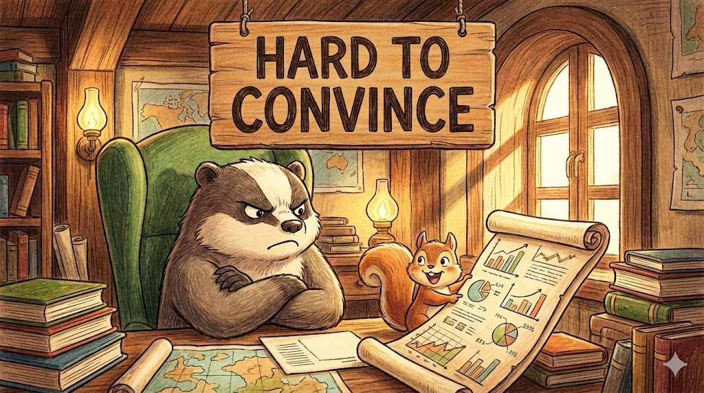 남의 말을 잘 믿지 않거나, 고집이 세서 '마음을 돌리려면 확실한 증거와 시간이 많이 필요한 사람' 을 묘사할 때 씁니다. 쉽게 넘어가지 않는 까다로운 상사나, 회의적인 투자자 등을 설명할 때 자주 사용합니다.