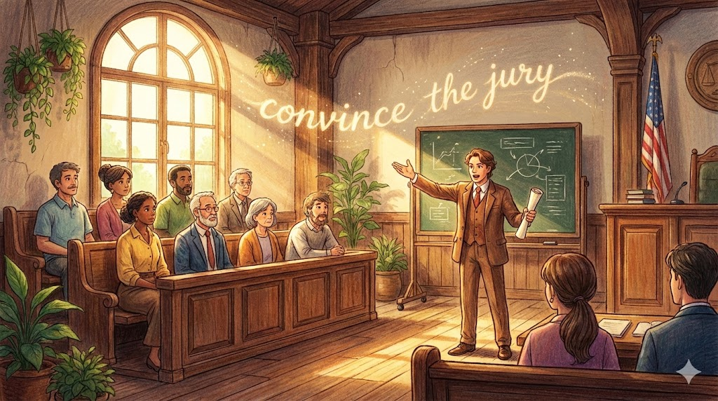 법정 드라마나 뉴스에서 자주 듣는 표현입니다. 판사가 아닌 일반 시민들로 구성된 배심원들에게 '피고인이 유죄인지 무죄인지를 증거와 논리로 확실하게 믿게 만드는 것' 입니다. "Beyond a reasonable doubt(합리적 의심의 여지가 없을 정도로)" 설득해야만 재판에서 이길 수 있습니다.