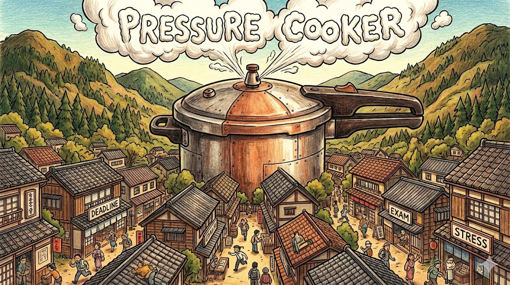 원래는 증기 압력을 이용해 음식을 빨리 익히는 조리 도구(Instant Pot 등)를 말하지만, 비유적으로는 '극심한 스트레스나 압박감으로 인해 언제 폭발할지 모르는 긴장된 환경' 을 뜻합니다. 입시 경쟁이 치열한 학교나 성과 압박이 심한 직장을 묘사할 때 자주 쓰입니다.