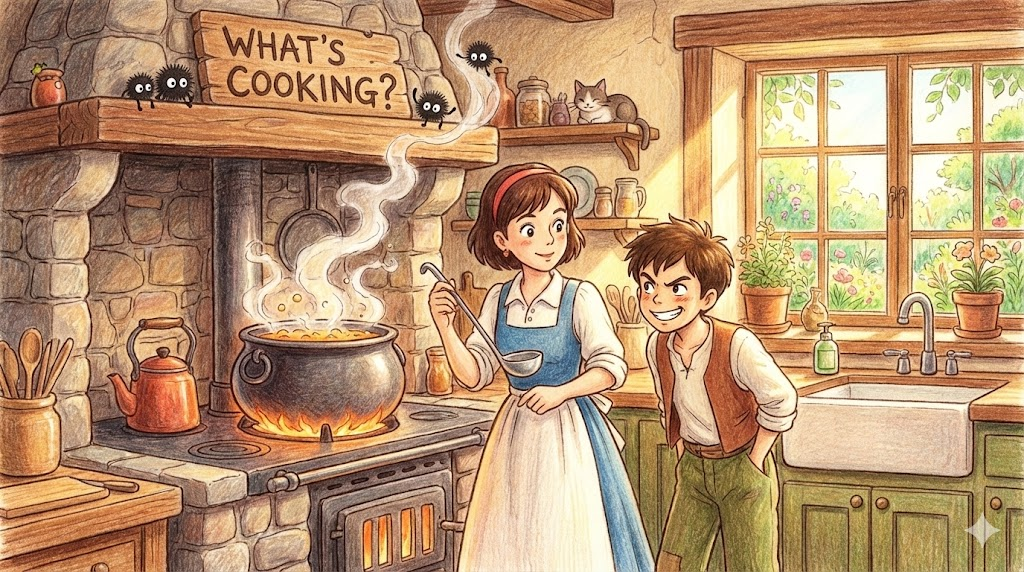 또한, 상대방이 뭔가 비밀스럽게 준비하거나 계획하고 있는 낌새가 보일 때 "너 무슨 꿍꿍이야?" 라는 뉘앙스로 묻기도 합니다. 물론 부엌에서 정말로 "뭐 요리해?"라고 물을 때도 씁니다.