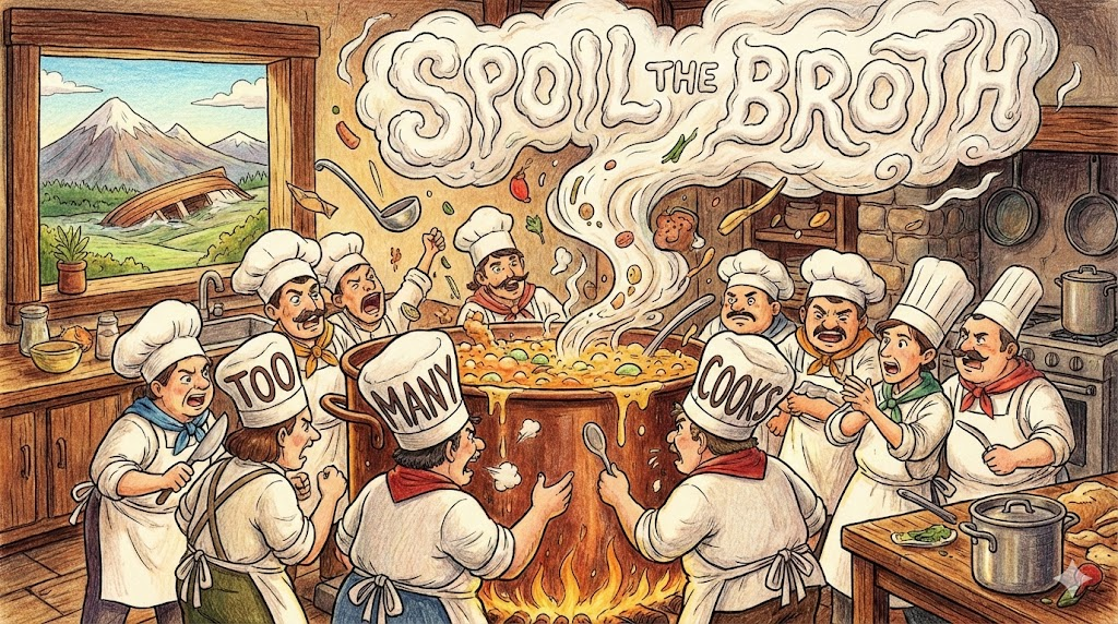 - Everyone gave different advice, proving that too many cooks spoil the broth.