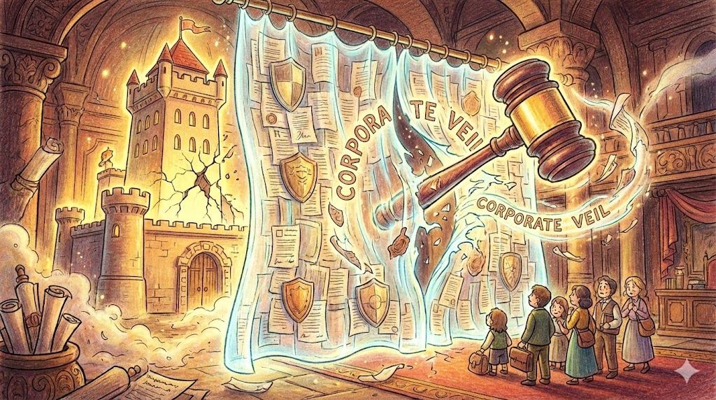 - Corporate veil: 법인(회사)과 소유주(주주)를 분리하는 법적인 막, '법인격의 베일' 입니다. 회사가 망해도 사장 개인 재산은 건드리지 못하게 보호해 주는 방패입니다. (사기를 치면 법원이 이 베일을 뚫는데, 이를 *"Piercing the corporate veil"*이라고 합니다.)
