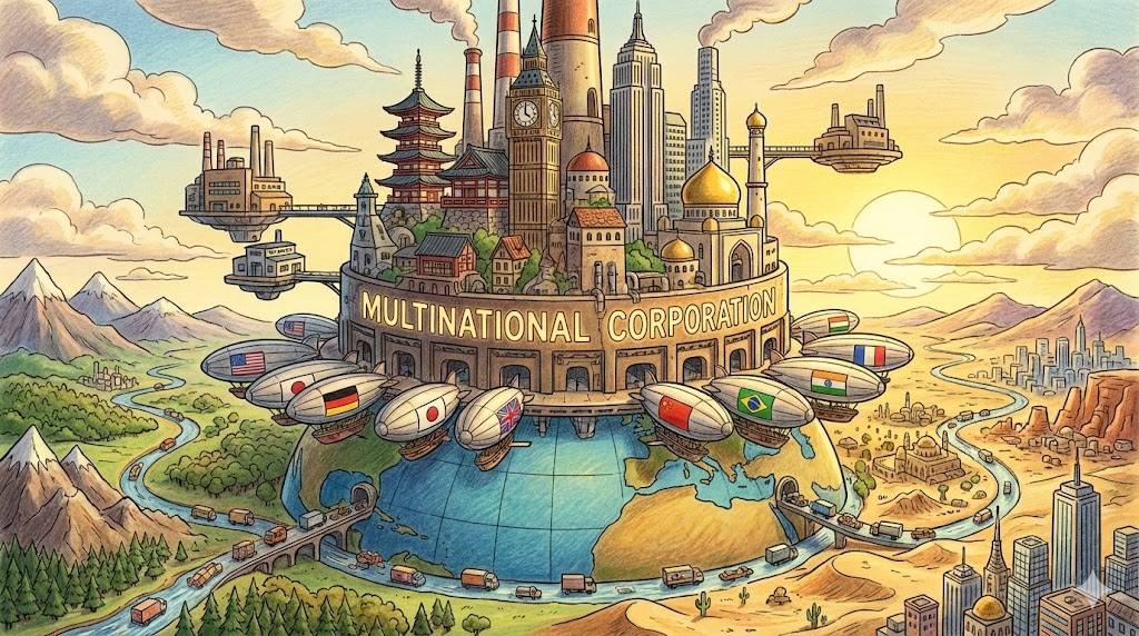 - 해석: (경제/지리 최빈출) 본국뿐만 아니라 여러 나라에 지사나 공장을 두고 활동하는 거대 기업입니다.