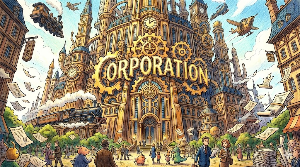 'corporation'은 라틴어 *corpus(신체/몸)*에서 유래했습니다. 법적으로 사람처럼 권리와 의무를 가지는 "법인(Legal Body)" 을 뜻하며, 흔히 "대기업" 이나 "주식회사" 를 가리키는 말로 쓰입니다.
