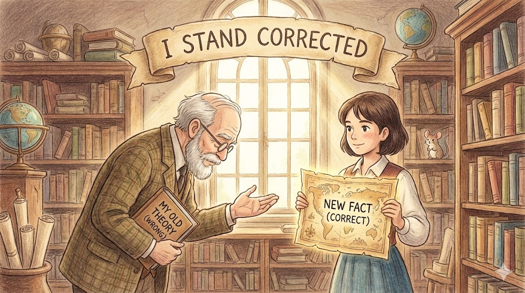 - The professor stood corrected after the student pointed out the error.
