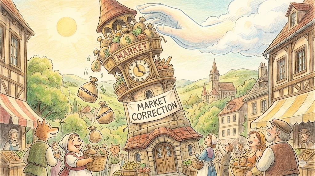 주식 시장이 너무 뜨겁게 과열되었을 때, 거품을 빼고 적정 가격을 찾아가기 위해 주가가 10% 정도 떨어지는 현상을 말합니다. '폭락(Crash)'과는 다릅니다. 오히려 시장이 건강하게 유지되기 위해 '잘못된(너무 비싼) 가격을 올바르게(Correct) 고치는 과정' 으로 봅니다.