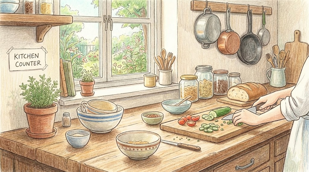 요리를 준비하거나 물건을 올려두는 '주방의 평평한 상판' 을 말합니다. 한국에서는 흔히 '싱크대'라고 뭉뚱그려 부르지만, 영어로는 물이 나오는 개수대는 'Sink', 작업을 하는 평평한 곳은 'Counter' 또는 'Countertop' 이라고 정확히 구분합니다.