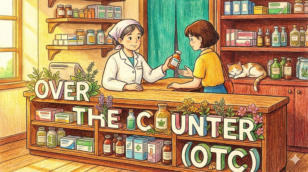 - Over-the-counter (OTC). (처방전 없이 살 수 있는. - 약국의 계산대(Counter) 너머로 바로 받을 수 있다는 뜻에서 유래한 일반 의약품)