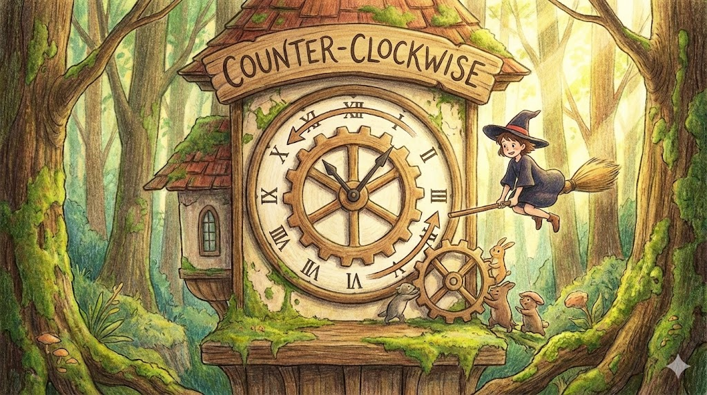 - 해석: (수학/방향) 시계 바늘이 도는 반대 방향(왼쪽)으로 도는 것입니다. 영국에서는 Anti-clockwise라고 합니다.