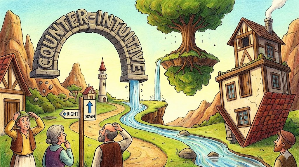 우리의 '직관(Intuition)'이나 상식으로는 "당연히 A겠지"라고 생각되는데, 실제로는 '정반대인 B가 정답인 경우' 를 말합니다. 처음 들으면 고개를 갸웃거리게 되지만, 논리적으로 따져보면 맞는 말일 때 씁니다. "의외네?", "상식 밖인데?"라는 느낌입니다.