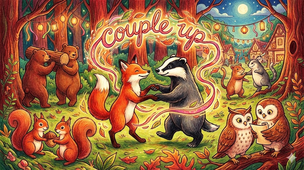 - The teacher asked the students to couple up for the project. (선생님은 학생들에게 프로젝트를 위해 짝을 지으라고 요청했다.)
