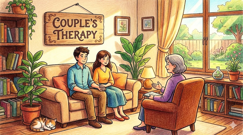 부부나 연인이 갈등을 해결하고 소통 방식을 개선하기 위해 전문가(Therapist)에게 받는 심리 상담을 말합니다. 'Marriage counseling(결혼/부부 상담)'과 거의 같은 뜻으로 쓰이지만, 법적으로 결혼하지 않은 연인이나 동거 커플들에게도 폭넓게 사용할 수 있는 포괄적인 용어입니다.