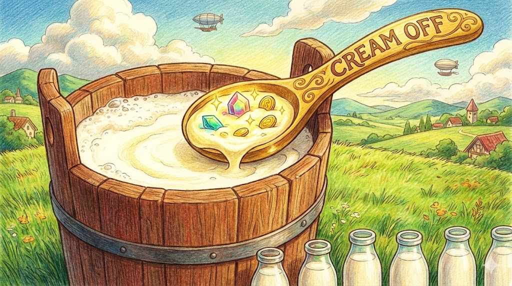 우유 표면에 떠오른 크림만 살짝 걷어내듯, 어떤 무리에서 '가장 우수한 사람이나 가치 있는 부분만 쏙 뽑아가는 행동' 을 말합니다. 때로는 기업이나 조직에서 이익의 노른자위만 몰래 챙기는 다소 이기적이거나 부정적인 뉘앙스(skim off)로 쓰이기도 합니다.