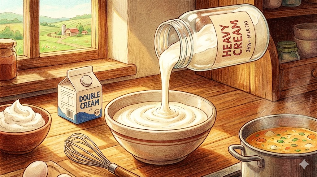 유지방 함량이 36% 이상으로 매우 높아 질감이 걸쭉하고 진한 우유 크림입니다. 요리할 때 수프나 파스타 소스를 진하게 만들거나, 앞서 말한 휘핑크림을 단단하게 올리기 위해 사용하는 아주 기본적인 요리/베이킹 재료입니다. 영국 영어로는 'Double cream'이라고도 부릅니다.