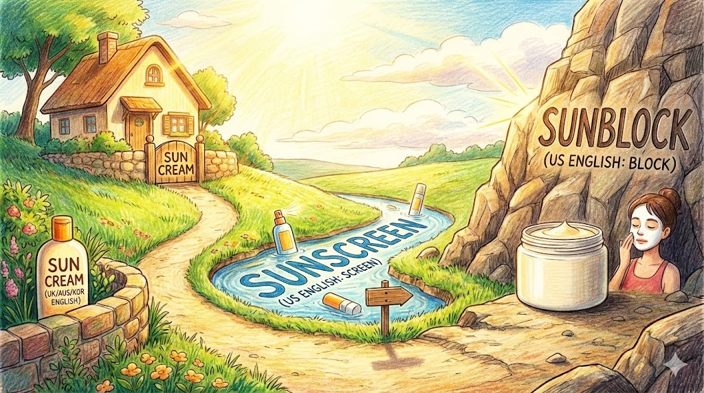 - Sunscreen / Sunblock: 자외선 차단제 (Sun cream은 영국식).