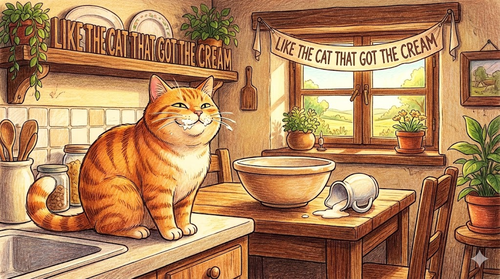 - 해석: (관용구/영국) 주인이 아끼는 크림을 몰래 다 먹어 치우고 입맛을 다시는 고양이처럼, 무언가를 성취한 뒤 매우 만족스러워하며 우쭐대는 표정을 지을 때 씁니다. (미국 영어에서는 like the cat that ate the canary를 주로 씁니다.)