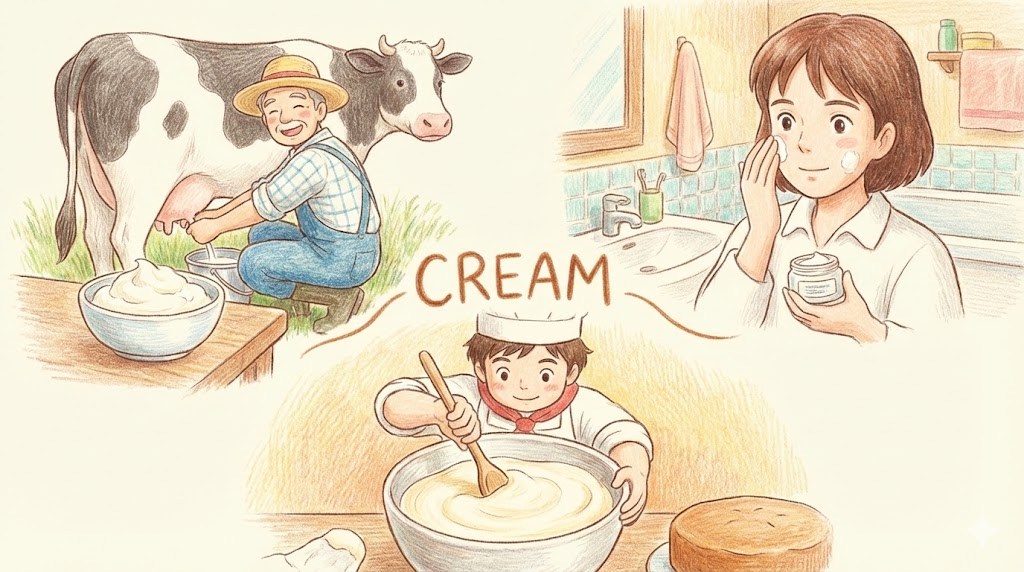 우유에서 분리한 고지방 유제품을 뜻하는 것이 가장 기본입니다. 그 부드럽고 걸쭉한 형태에서 착안하여, 얼굴에 바르는 화장품(moisturizing cream)이나 약국에서 피부에 바르도록 처방해 주는 연고(ointment) 등 부드러운 질감을 가진 물질들을 통틀어 '크림'이라고 폭넓게 부릅니다.