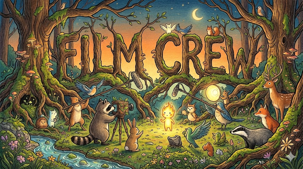 - Film crew: 영화나 방송 현장에서 카메라, 조명, 음향 등을 담당하는 '촬영팀(스태프진)' 입니다.