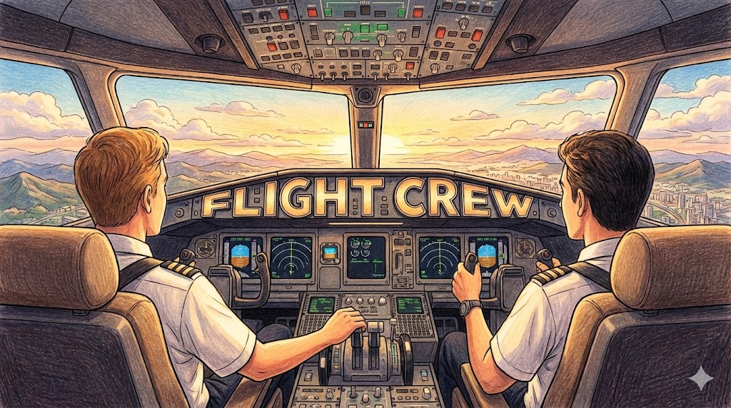 - 해석: (생활/독해) 비행기를 조종하고 기내 업무를 담당하는 팀 전체를 말합니다. 보통 기장과 부기장 등 조종실에서 근무하는 운항 승무원을 특정해서 부를 때 쓰이기도 합니다.