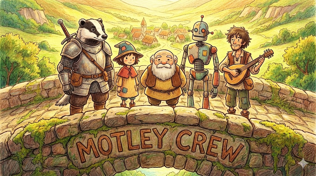 'Motley'는 본래 '잡색의, 얼룩덜룩한, 잡동사니의'라는 뜻입니다. 성격, 배경, 외모, 나이 등이 제각각이어서 '도무지 한 팀처럼 보이지 않는 잡다한 무리' 를 유머러스하게 부르는 말입니다. 영화나 소설에서 처음엔 오합지졸 같았지만 나중엔 의외의 시너지를 내는 매력적인 주인공 팀(가디언즈 오브 갤럭시 등)을 묘사할 때 아주 찰떡인 표현입니다.