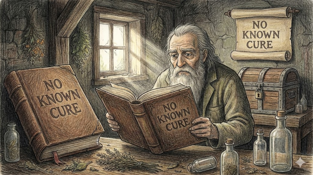 - no known cure: 현대 의학으로는 고칠 방법이 없는, 즉 '알려진 치료법이 없는(불치병인)' 상태입니다.