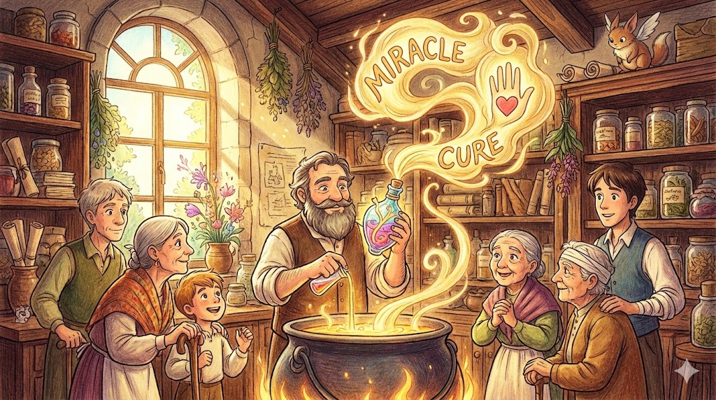 - 해석: 도저히 고칠 수 없을 것 같던 병을 낫게 하는 놀라운 치료법입니다. 때로는 과장 광고를 비판하는 지문에서 조롱의 의미로도 쓰입니다.