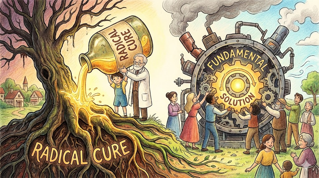 - radical cure: 일시적으로 증상만 가라앉히는 것(대증요법)이 아니라, 병의 뿌리를 완전히 뽑아버리는 '근본적인 치료(법)' 입니다.
