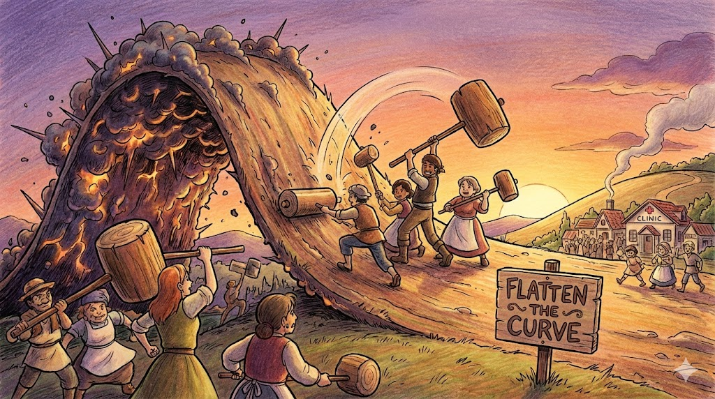 코로나19 팬데믹 기간 동안 전 세계적으로 유명해진 표현입니다. 감염자 수의 폭증(뾰족한 곡선)을 막아 의료 체계가 감당할 수 있는 수준 내에서 환자가 발생하도록 '확산 속도를 늦추는 것' 을 의미합니다. 전체 환자 수를 줄이는 것만큼이나, '한꺼번에 몰리지 않게 분산시키는 것' 에 초점을 맞춘 표현입니다.
