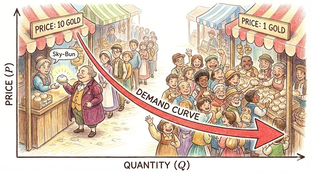 경제학의 가장 기초가 되는 곡선입니다. 가격(P)과 수요량(Q)의 관계를 나타내는데, 보통 '가격이 오르면 사고 싶은 마음(수요)은 줄어든다' 는 원리에 따라 오른쪽 아래로 향하는(downward-sloping) 모양을 가집니다.