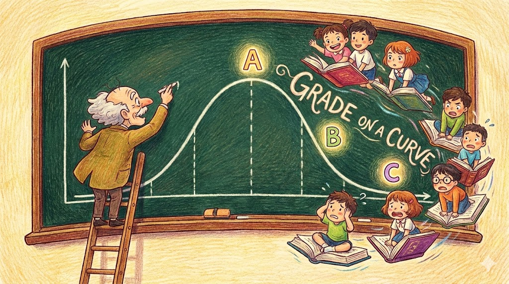 - 해석: (교육) 학생들의 점수를 종형 곡선(정규 분포)에 맞추어, 절대적인 점수가 아니라 남들과 비교한 등수에 따라 성적(A, B, C)을 부여하는 평가 방식입니다.