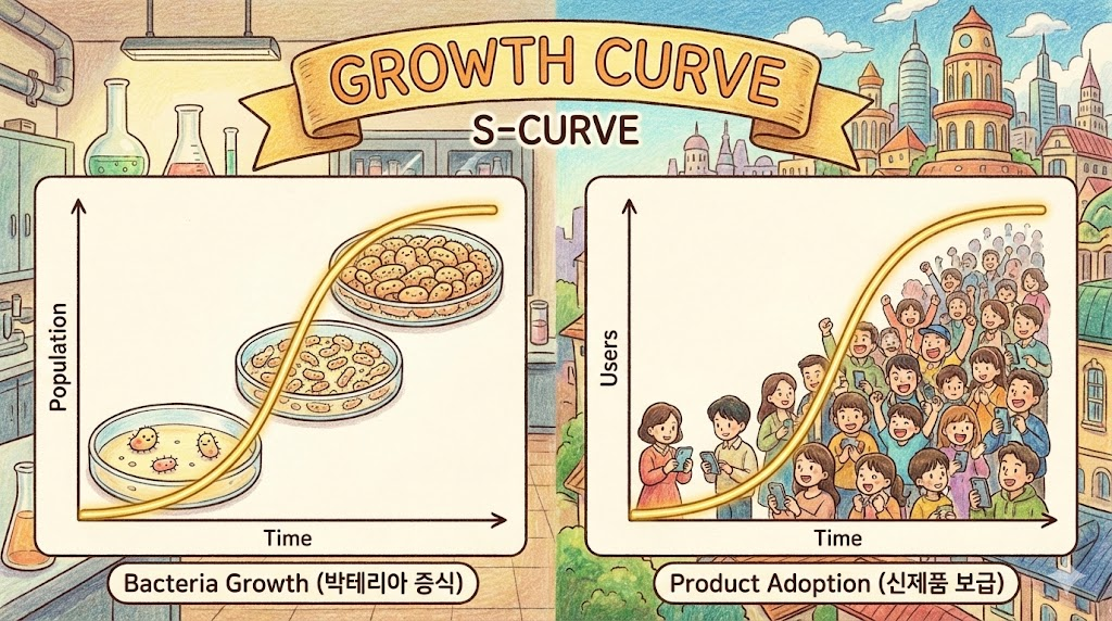 생물학에서 박테리아의 증식이나, 비즈니스에서 신제품의 보급 속도 등을 시간의 흐름에 따라 나타낸 곡선입니다. 처음엔 천천히 시작했다가 어느 순간 폭발적으로 성장하고, 결국 한계치에 다다라 평평해지는 'S자형 곡선(S-curve)' 이 가장 대표적인 형태입니다.