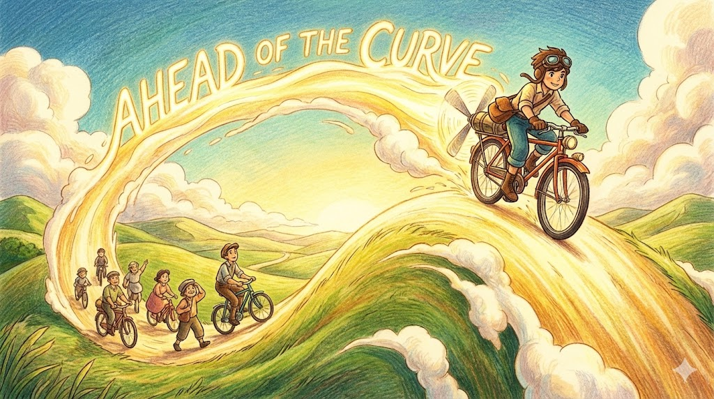 - 해석: (비즈니스/트렌드) 통계나 트렌드 곡선이 상승하기 전에 미리 그 앞에 가 있다는 뜻으로, 남들보다 혁신적이거나 한발 앞서 유행을 파악하는 상태를 말합니다.