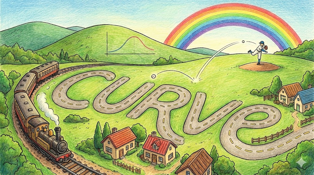 직선이 아닌 부드럽게 굽은 선이나 모양을 뜻합니다. 도로가 굽어지는 지점뿐만 아니라, 사람의 신체 라인, 통계 그래프의 곡선, 혹은 야구에서 공이 휘어지는 '커브' 등 물리적·추상적 형태에 두루 쓰입니다.
