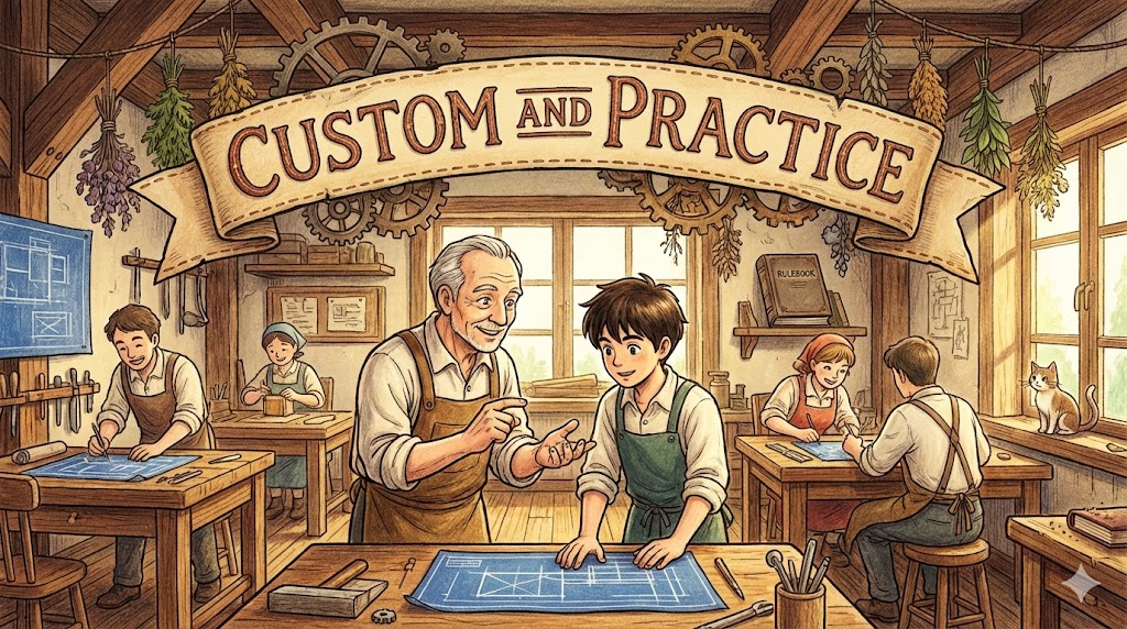 - 해석: (법률/노동) 문서화된 법이나 계약서에 명시되지는 않았지만, 일터나 사회에서 너무 오랫동안 반복되어 마치 규칙처럼 당연하게 여겨지는 방식입니다.