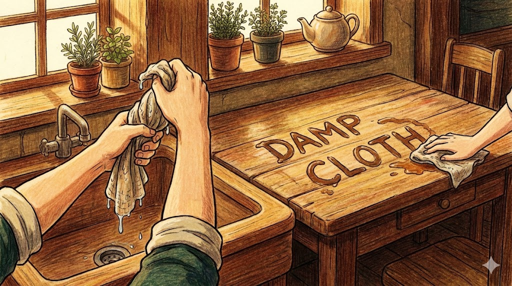 - Wipe the table with a damp cloth. (젖은 걸레로 탁자를 닦으세요.)