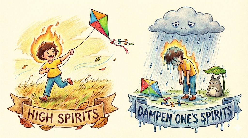 - dampen one's spirits: 'Dampen'은 '축축하게 하다'라는 동사입니다. 누군가의 영혼(Spirits)을 물에 젖은 솜처럼 무겁게 만들어 '기를 꺾다(의기소침하게 하다)' 입니다.